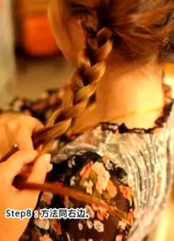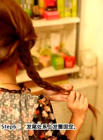 步骤九:同样将头发一直编到发尾,然后用皮筋将头发固定。