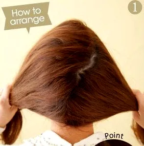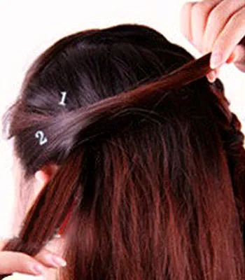 步骤二:再从左边取一束头发出来,分成两份,标记为1.2,然后把2发束盖在1发束上面。