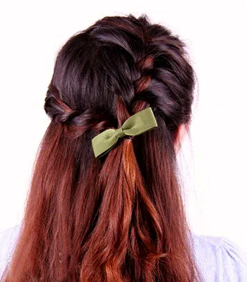 最新瘦脸公主半扎韩式编发发型:甜美的编发,配上绿色的蝴蝶结,尽显女生优雅的气质,下面跟着小编学起来吧!