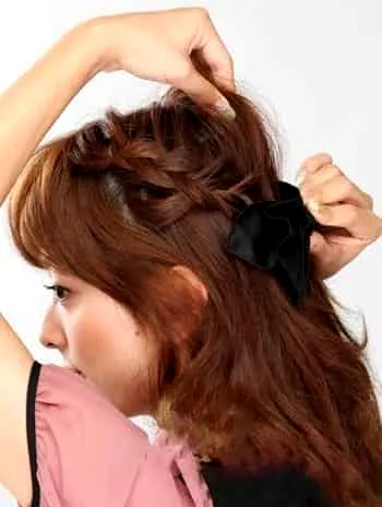 Step6:然后把另一侧的头发像刚刚编的辫子一样,将头发加进去编三股发辫。编好后用大的蝴蝶结把辫子固定在脑袋后方。