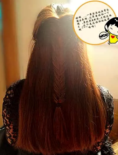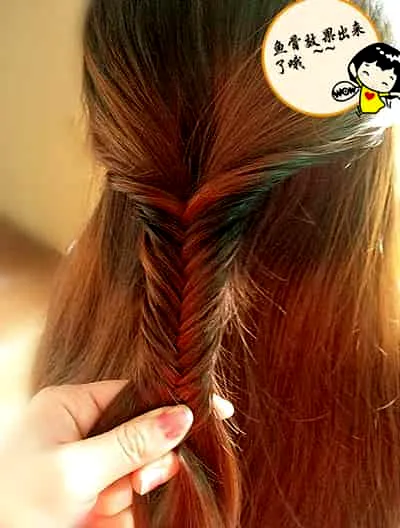 步骤六:按照之前的编发步骤将头发一直编下去,鱼骨辫的形状就出来了哦!
