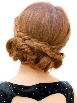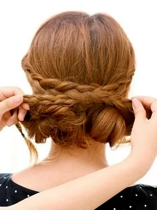 步骤四:将两束编织好的三股辫挽到后脑勺处,互相交叉起来。