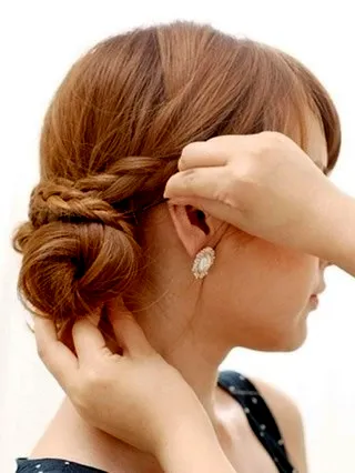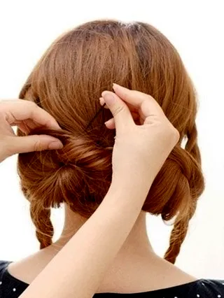 步骤五:然后将两股发辫的发尾分别固定在发髻的下面。