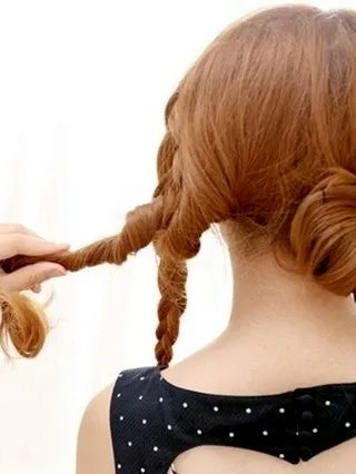 步骤三:将两束扭转的头发盘成花苞形状,用发夹固定在脑后。