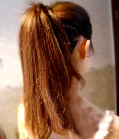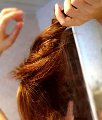 Step5:用手抓住刚刚梳蓬的马尾后段部分稍稍向右边扭转,要一直保持蓬松感。