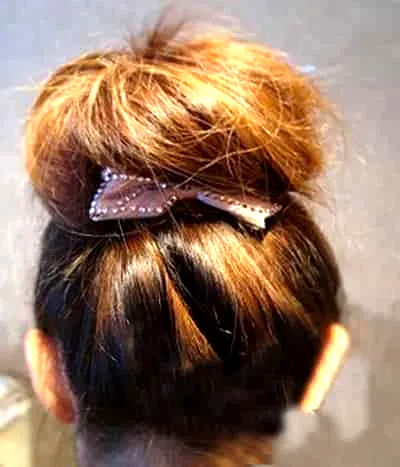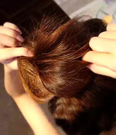 Step6:将马尾向皮筋处绕转,再把发尾塞进皮筋里面,并用小发卡固定住头发。