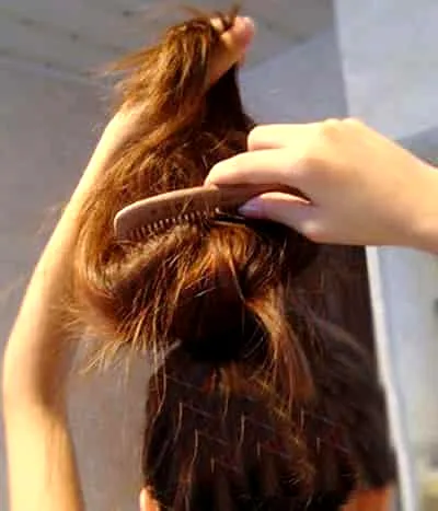 Step3:从马尾上方挑取一小束头发,拉高并用梳子进行倒刮,刮出蓬松感。