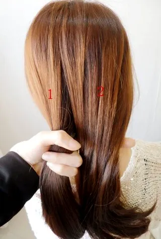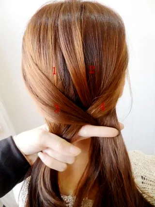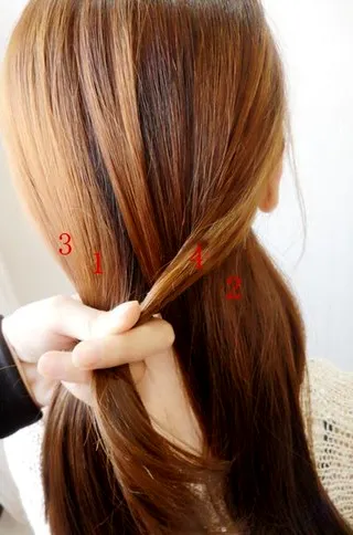 步骤三:将3、4两股头发交叉,编发时1,2股要始终保持不动。加股时再从1,2股中不断的挑出发束。