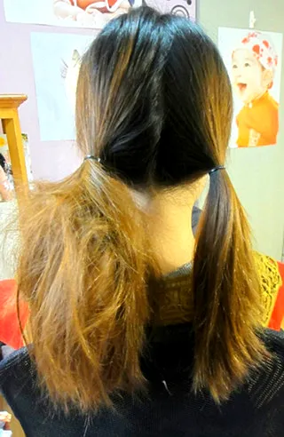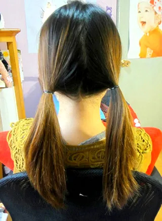 步骤一:将头发分成左右两份,然后扎成两个低马尾。
