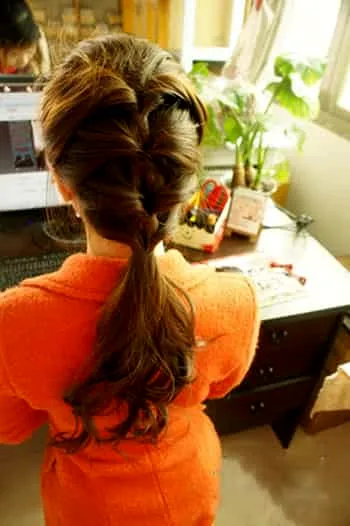 步骤1:以头顶为中心,左右两边各分出一股头发,然后将两股头发合并,没一股中间松一个洞,往下拉。