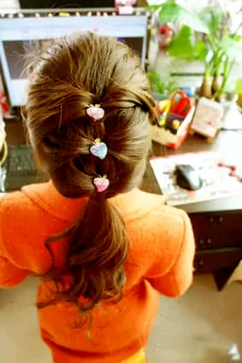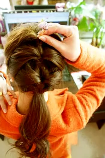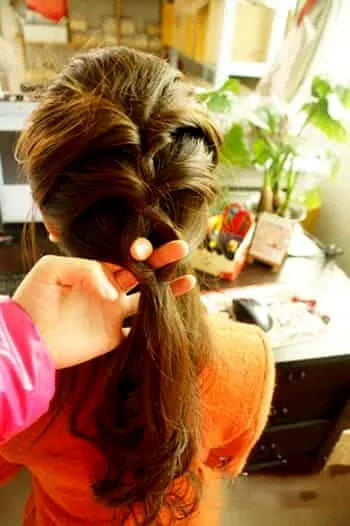 步骤4:在将准备好的发夹,**每股平皮筋的中间,怕掉的话可以用黑色夹子固定。