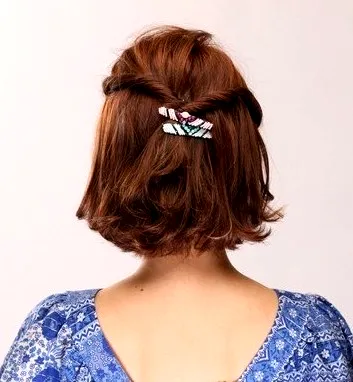 名媛气质显瘦短发编发步骤五:左边弄好后,右边也以同样的方便取一束头发扭转起来,用黑色的一字夹固定在脑后位置。