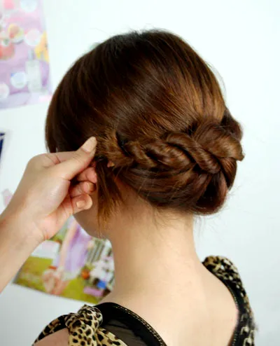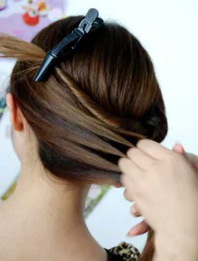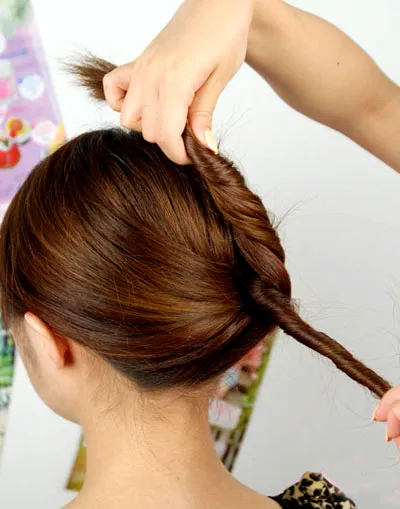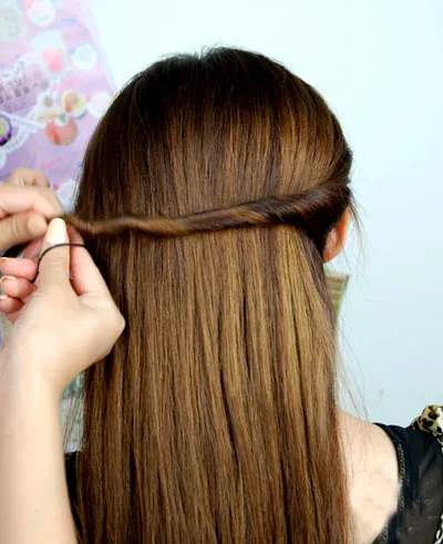 步骤三:然后把这一发束向一内扭转起来,像扭麻花辫的方式,再拉至右边位置。
