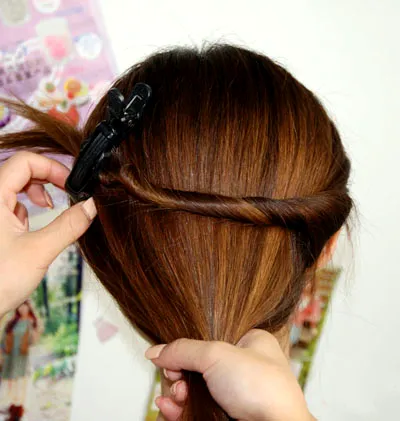 步骤五:我们先把发辫用大的一字夹固定在右边,再把剩下来的头发聚拢在一起。