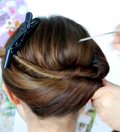 步骤七:一样的方法把所有聚拢的头发扭转起来,放在右边的位置,再用尖尾梳把头顶的头发拉蓬松,营造空气感。