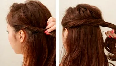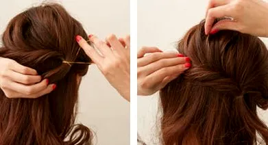 步骤四:完成编发之后,将另外一侧的头发卷曲起来束起,像上面左边图片一样的效果。细心的将其卷成麻**式的形状,再绕过头顶,效果也就快差不多完成了。