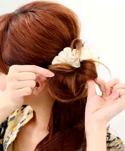步骤四:然后就是微调花苞公主头的扎发,用手将花苞公主头的发丝往左右两边轻轻的撕扯,打造出凌乱的感觉。