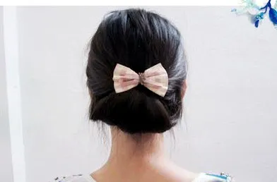 3、然后将扎好的马尾拉起,慢慢塞进去刚才耳际两边马尾内,一直将所有的头发塞进去后,接着用夹子从上往下的将头发固定住,最后还可以用搭配上一个蝴蝶结。