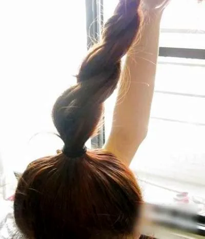Step5:然后将两束头发互挽。头发一直互挽到发尾处。