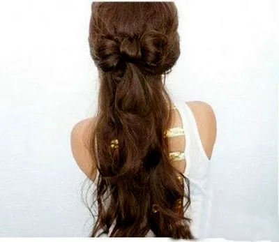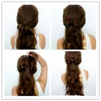 Step:首先把两侧的头发抓起来,后脑勺的地方不需要管,然后用橡皮筋扎起来,从中间均匀分开,用小夹子固定,然后在冲中间抓一撮头发,往上绕,再从皮筋和后脑勺的空隙中拉下来就可以了,一款甜美减龄娇俏的蝴蝶结编发就完成拉。