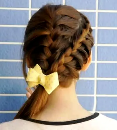 Step4:接着开始编织右边的头发,这次要注意的是,不能编织的过大,在编织蜈蚣辫的过程中,不取左边的头发融合进来,而是只取右边外围的发束编织进来,打造出“半蜈蚣”的效果就好了,最后将两股蜈蚣辫扎在一起,搭配你喜欢的小发饰就可以了哦。