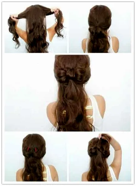 Step4:从中间抓一小撮头发,往上方绕过去,穿过中间再往下拉,用夹子整理一下。