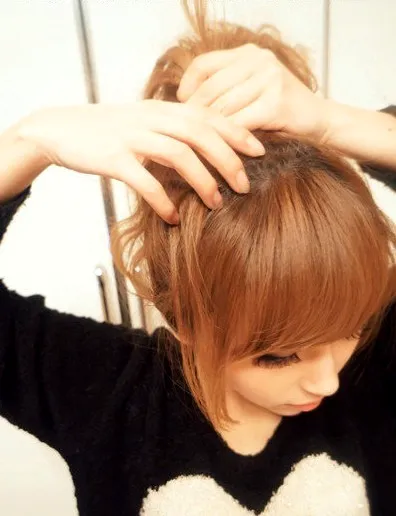 步骤九:绕过去之后,将发尾藏进头发中,用黑色小夹子固定。