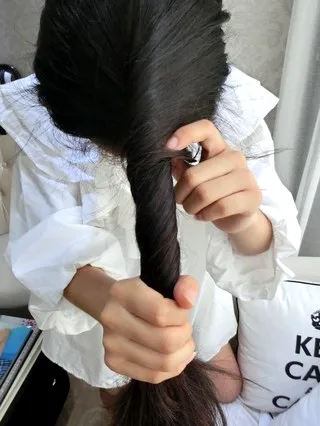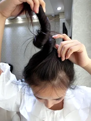 第二步:将所有头发一把抓住,抓好以后就开始顺着一个方向扭 就像拧麻花一样,头发扭到一定的程度,它自己就会慢慢缠成一个圈 在这个过程中。我们是要确定这个**头 是在我们想要的位置上。