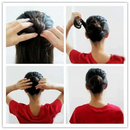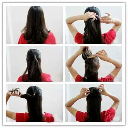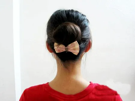 Step2:固定好小**后,将下面的头发往上拉,围着**的根部旋转,把所有的头发都缠绕进去就好了,一款简单甜美的**头扎发就完成了。