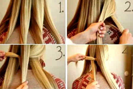 步骤3-4:将右一股的头发放在右三股发丝的下方,再绕过右四股的头发上。