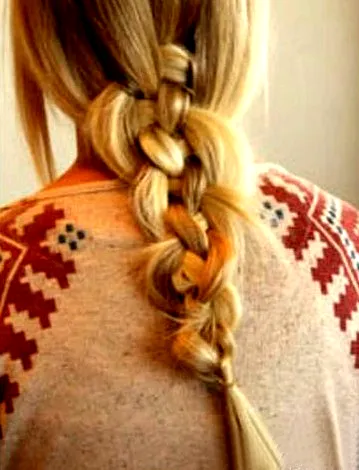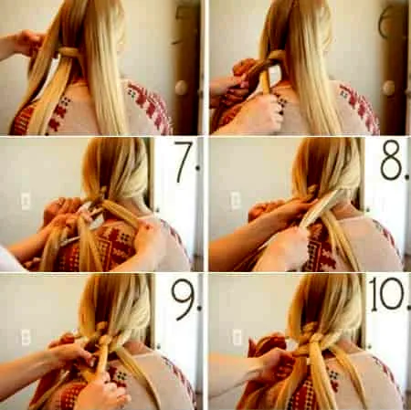 步骤7-8:将右三股的头发从最后一股头发下面穿过,再将右二股的头发放在最后一股头发上方。