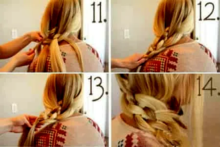 步骤11-12:将右二股的头发和右一股的头发交叉,依次类推,继续往下编发。