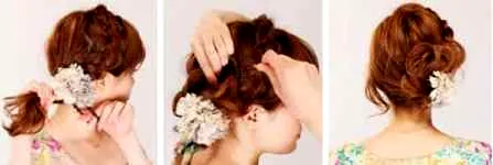 Step4:接着把后脑勺的头发以及侧面的辫子一起用橡皮筋绑好,并且加上花朵发饰。