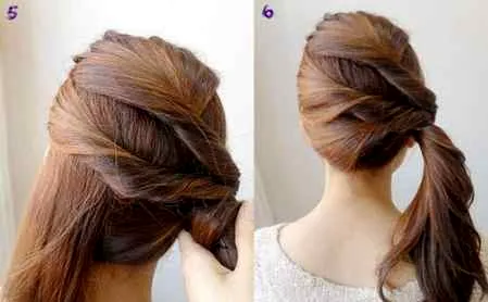 步骤四:将上面那部分头发随意的扭转,注意不要太紧,方向向着右边的马尾绕起来,分界线记得要盖住哦!
