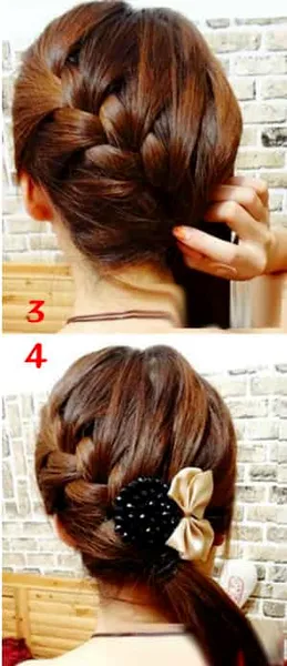 步骤二:步骤一不变,将鱼骨辫编发延续到右耳,将余下所有的头发编进去,然后佩戴一个蝴蝶结式样的发饰,第二款发型就美美的出现了。(编出效果如图3,4)