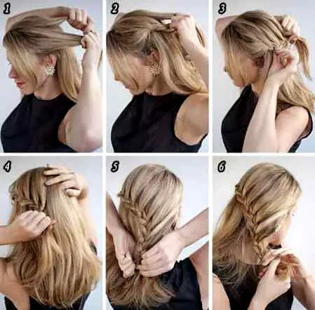 4-6、继续往后编,开始时辫子高度一直水平过来,编到中间时,开始编出一个优雅的弧度。上面的头发编完后,开始编普通的三股辫子,一直编完,发尾先用小发夹固定住。