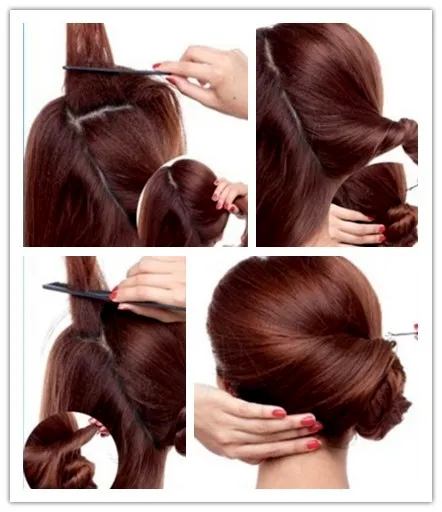 步骤2:将头顶处的发丝轻轻的放下,保持住根部的蓬松,梳理齐表面的发丝,和下方的头发一起,在右耳后方处顺时针的拧转,注意在扭转时也要保持蓬松感。扭转好发丝后,用夹子固定住。
