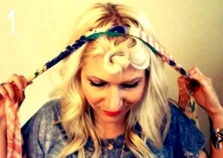 Step1:首先将刘海前面的头发预留出来备用,然后将发带折成条状,从头发下方往上绕过,形成发箍的样子。