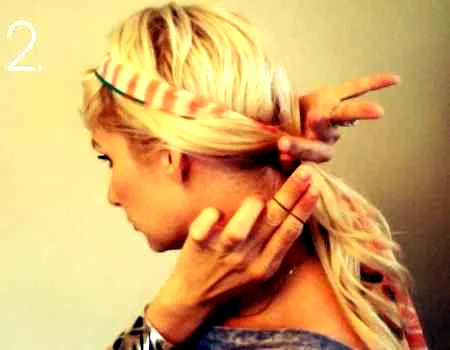 Step2:将发带的两端转到后脑勺,然后用皮筋把发带和头发全部扎成一个低马尾。