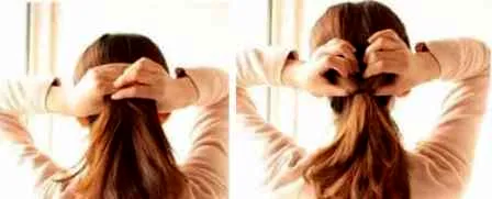 步骤二:接着用皮筋把开始三分之二的头发全部扎起来,用手在头发中间挖一个洞出来。