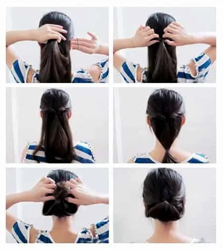 Step5:把扎好的马尾拉起来塞进开始挖的洞里面,塞到皮筋的位置就可以了,皮筋的部位也是要塞进去的。