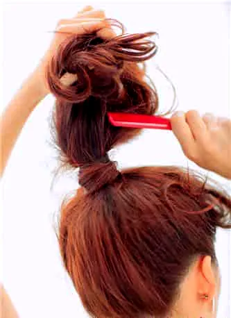 用发梳将马尾辫倒梳打毛,使其更加蓬松,之后盘起来的**也会更加大和自然,不会有过于呆板的现象。