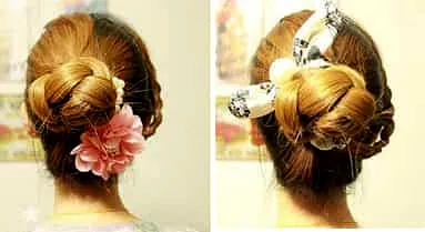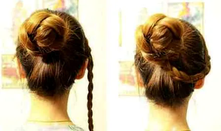 步骤7:将编好的发辫向一侧缠绕橡皮中心,盘起来,如图中所示的效果。