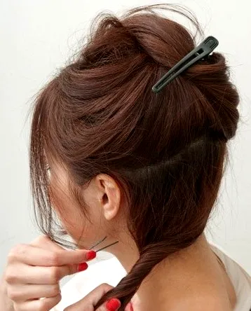 步骤五:然后将头顶的发束也混在下半部分头发中,每旋转一束头发用一根发夹固定,以此类推。