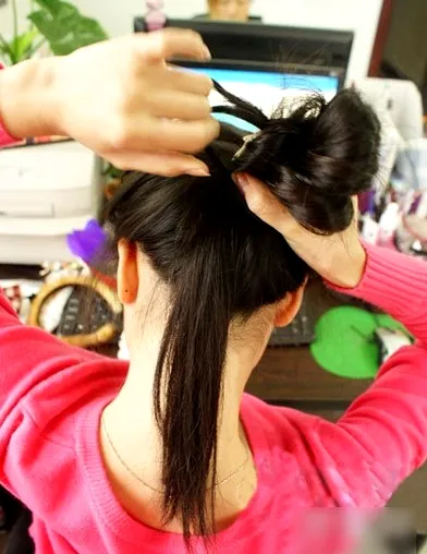 步骤四:然后将扎好的发束轻轻拉扯,形成一个花苞状,再用黑色发夹固定一下。