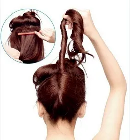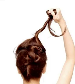 4、再把之前头部上方的头发松开,用食指顺时针拧转直至发尾盘旋在头顶处。