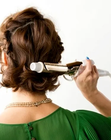 步骤2:将后面未做编发的头发用卷发棒将头发弄卷,如图示,在发尾处将头发向外卷。