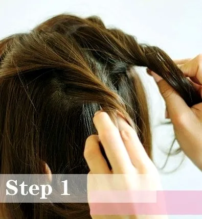 步骤1:首先要从头顶处取出两束发,避免取刘海处的发丝,两束发的量不用太多,最好是围绕发旋处取出即可,取出后将两束发都向内卷,先固定一侧,做为备用。