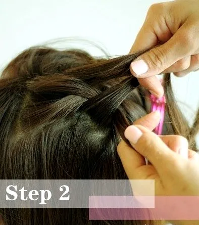 步骤2:先编左侧的发束,先将头发分成三等分,编成简单的三股辫,每编一次向一旁借发,将原先三股中的两股发合并,直到取出的发束全部取完,用橡皮固定住。