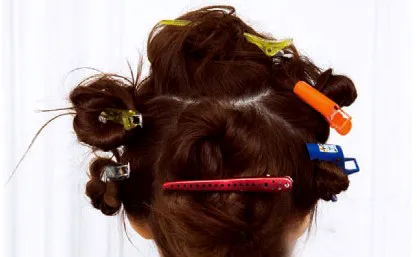 Step1:如图所示,用发夹将头发分成六部分,然后在头发中间贴上蓬蓬贴,使头发饱满起来。